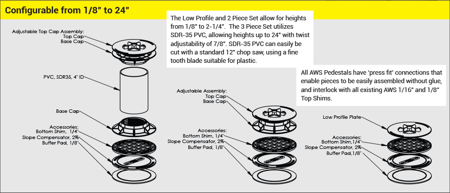 Your project deserves a more professional edge piece. AWS™ brings the answer to these difficult edging dilemmas with our new AWS Perimeter Pedestal®. It snaps together just like the full pedestal system and component shim pieces.